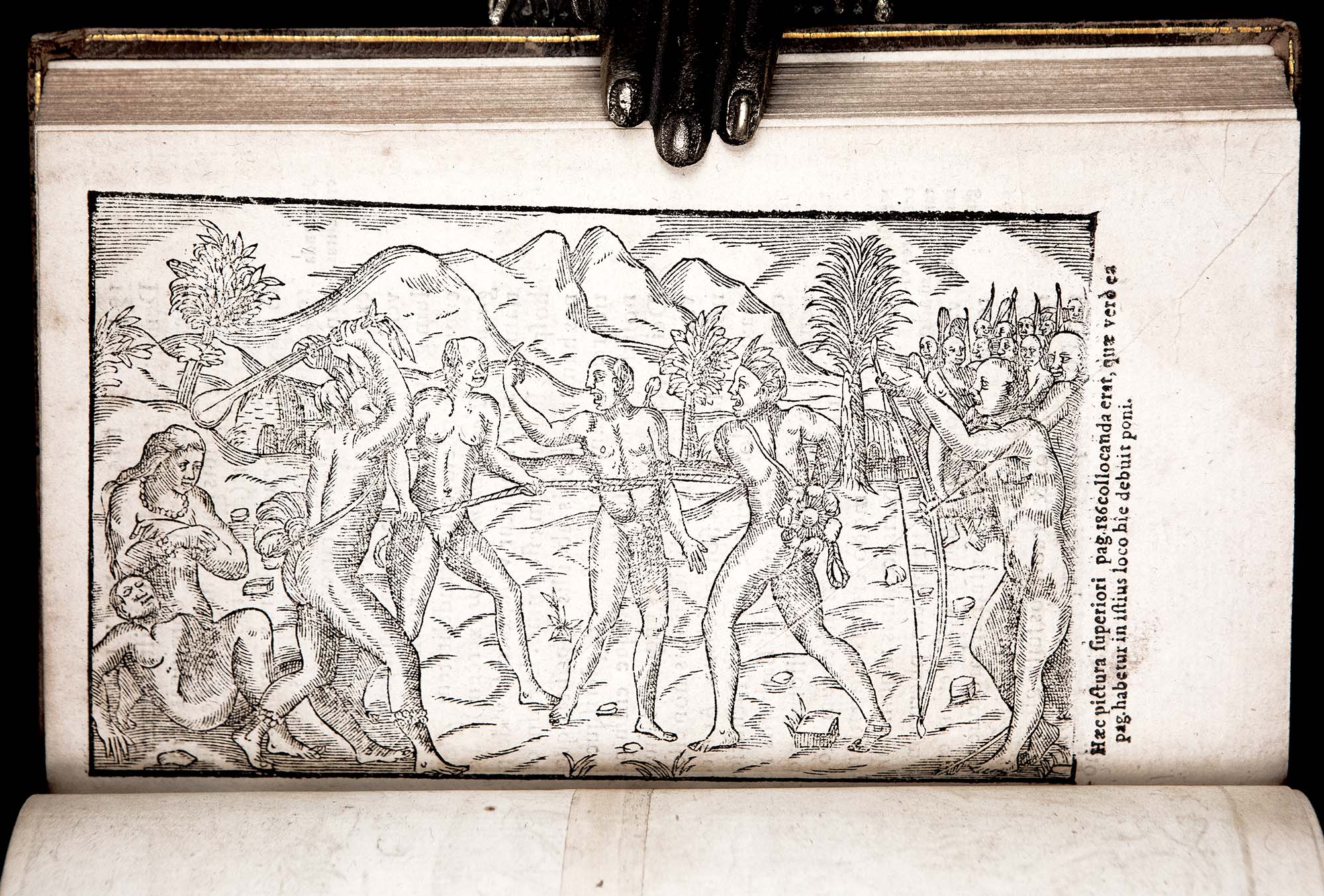 Illustrated with 7 full-page woodcuts in the text, as well as a fine folding plate (often missing), which depicts a battle between two native tribes. Some printed musical notations in text; woodcut headpieces and initials.