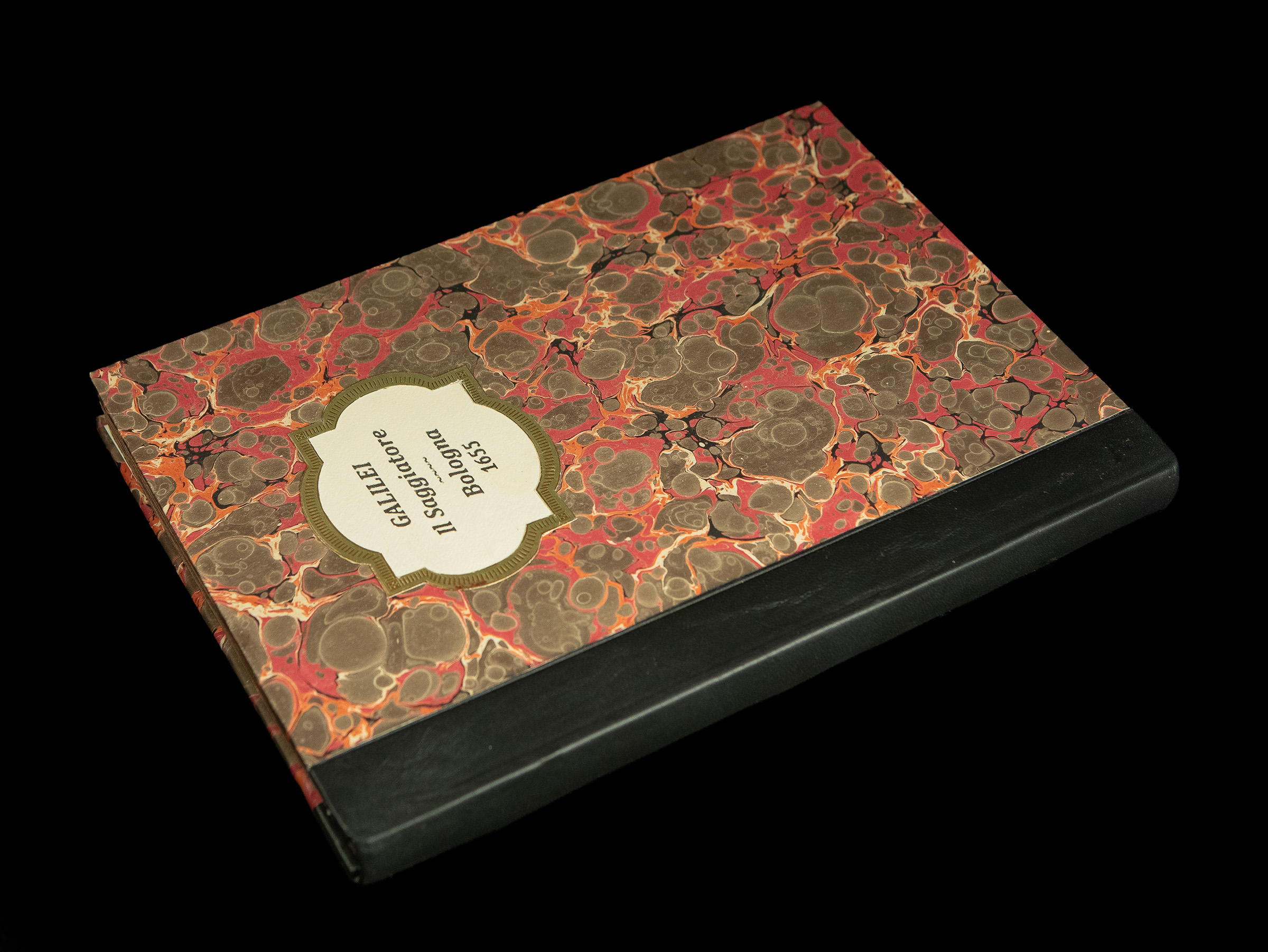 Quarto; text block measures 23 cm x 16.5 cm, wide margins. All edges gilt. Rebound in modern quarter black leather over marbled boards; unlettered flat spine; printed paper label in gilt frame to front cover. Edges rouged.