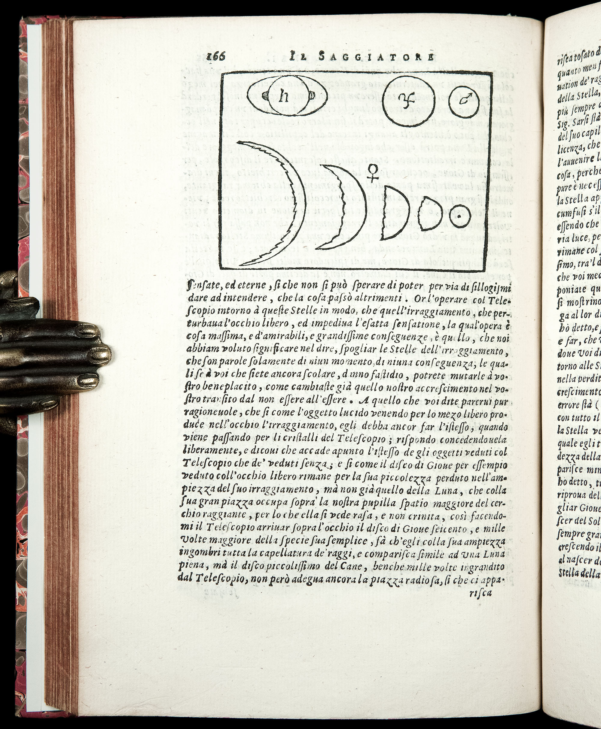 Galileo used a sarcastic and witty tone throughout the essay. The book was read with delight at the dinner table by Urban VIII "This was a truly masterful piece of sarcastic invective and criticism. It is still read today in Italian language classes in Italy as a fine example of the use of rhetoric devices in the Italian language.” (P. Machamer, The Cambridge Companion to Galileo, 1998, p. 21). The woodcut on p. 166 of this 1655 edition closely reproduces the copperplate engraving in the 1623 First Edition, which contained THE EARLIEST PRINTED ILLUSTRATION OF THE RING OF SATURN, along with the planet Mars in inferior and superior conjunction, and the phases of Venus.