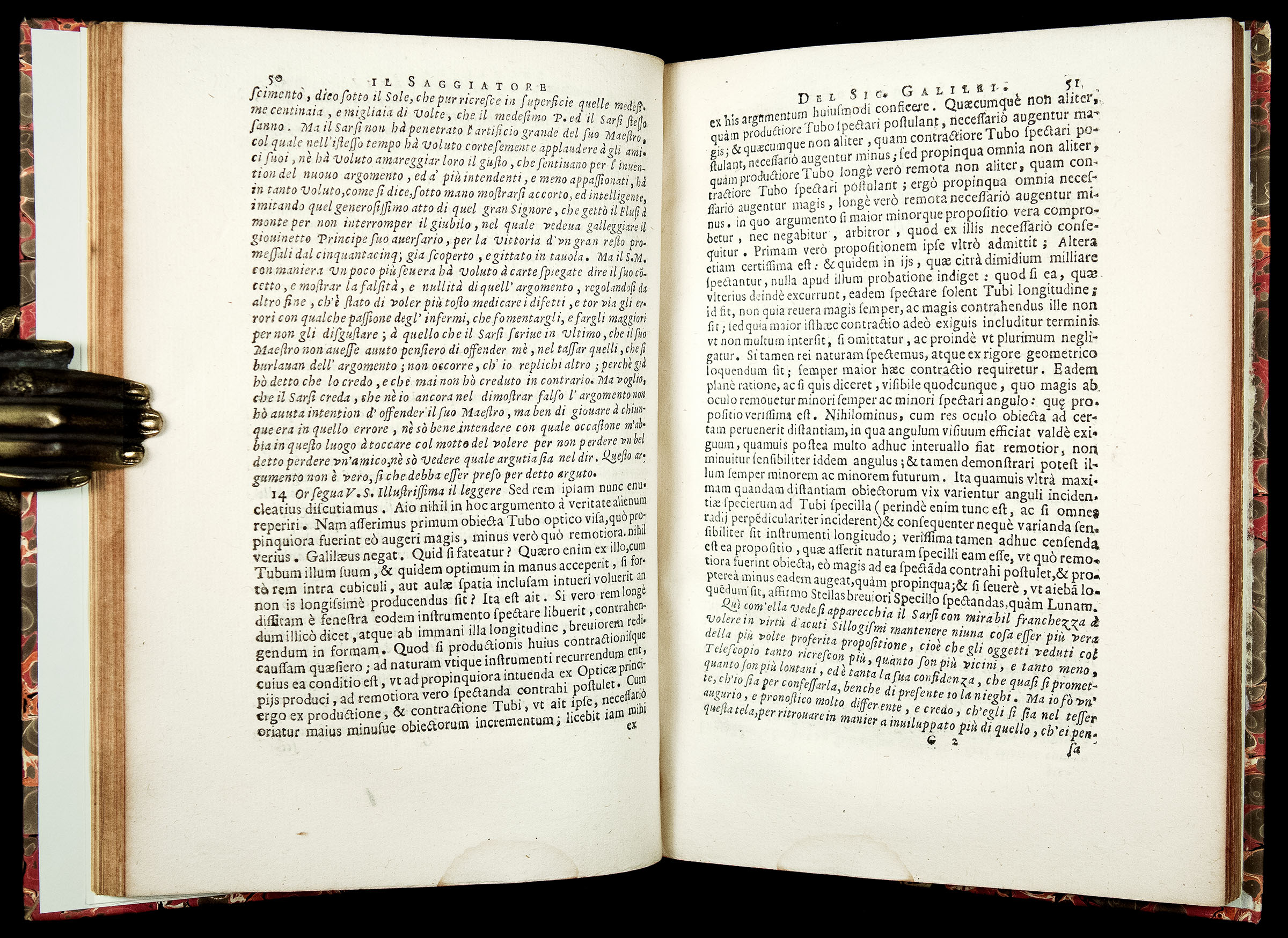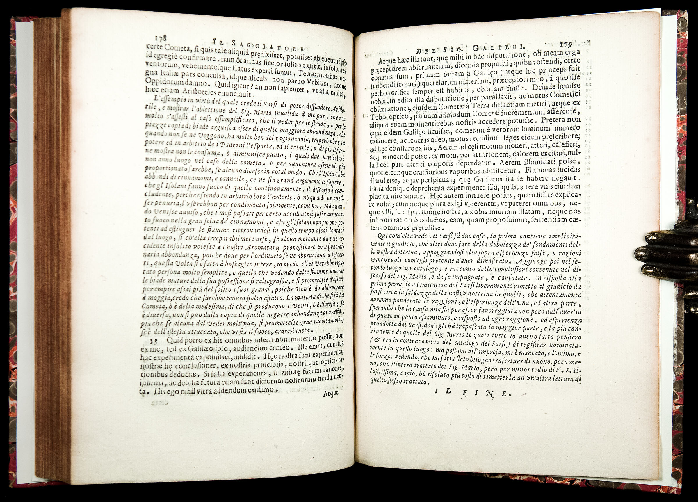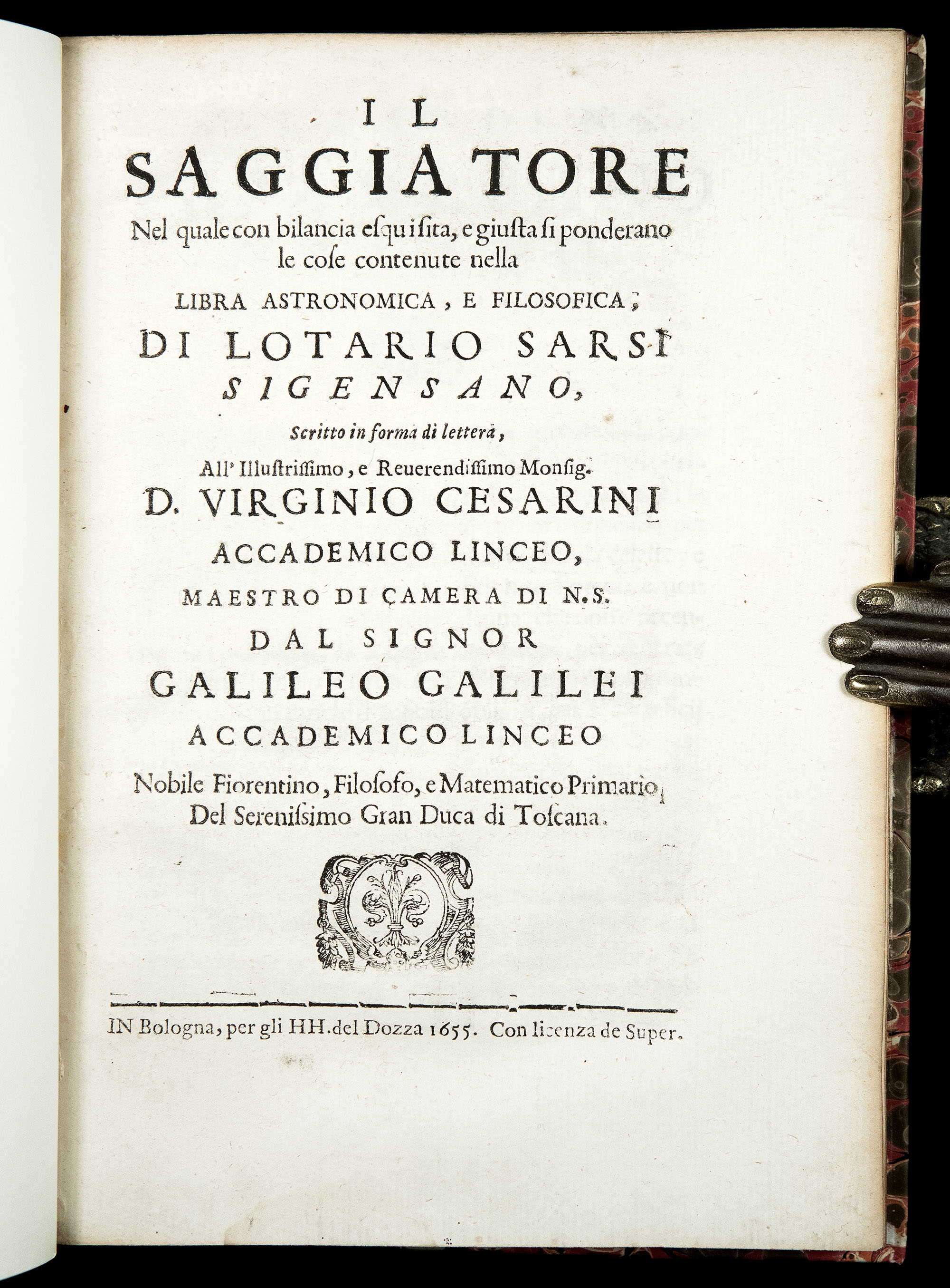Often viewed as Galileo’s "scientific manifesto," Il Saggiatore (i.e. “The Assayer”) was the first of Galileo’s works written after the Inquisition’s warning not to propound or defend the Copernican theory (which he still does, although in a covert way). The writing of Il Saggiatore was precipitated by the appearance of three comets in the autumn of 1618 and the dispute over whether they were atmospheric or celestial phenomena. The work is believed to have significantly aggravated (or, perhaps, even originated) the rift between Galileo and the Jesuits, which ultimately led to his imprisoned by the Inquisition after the publication of the Dialogo in 1632.