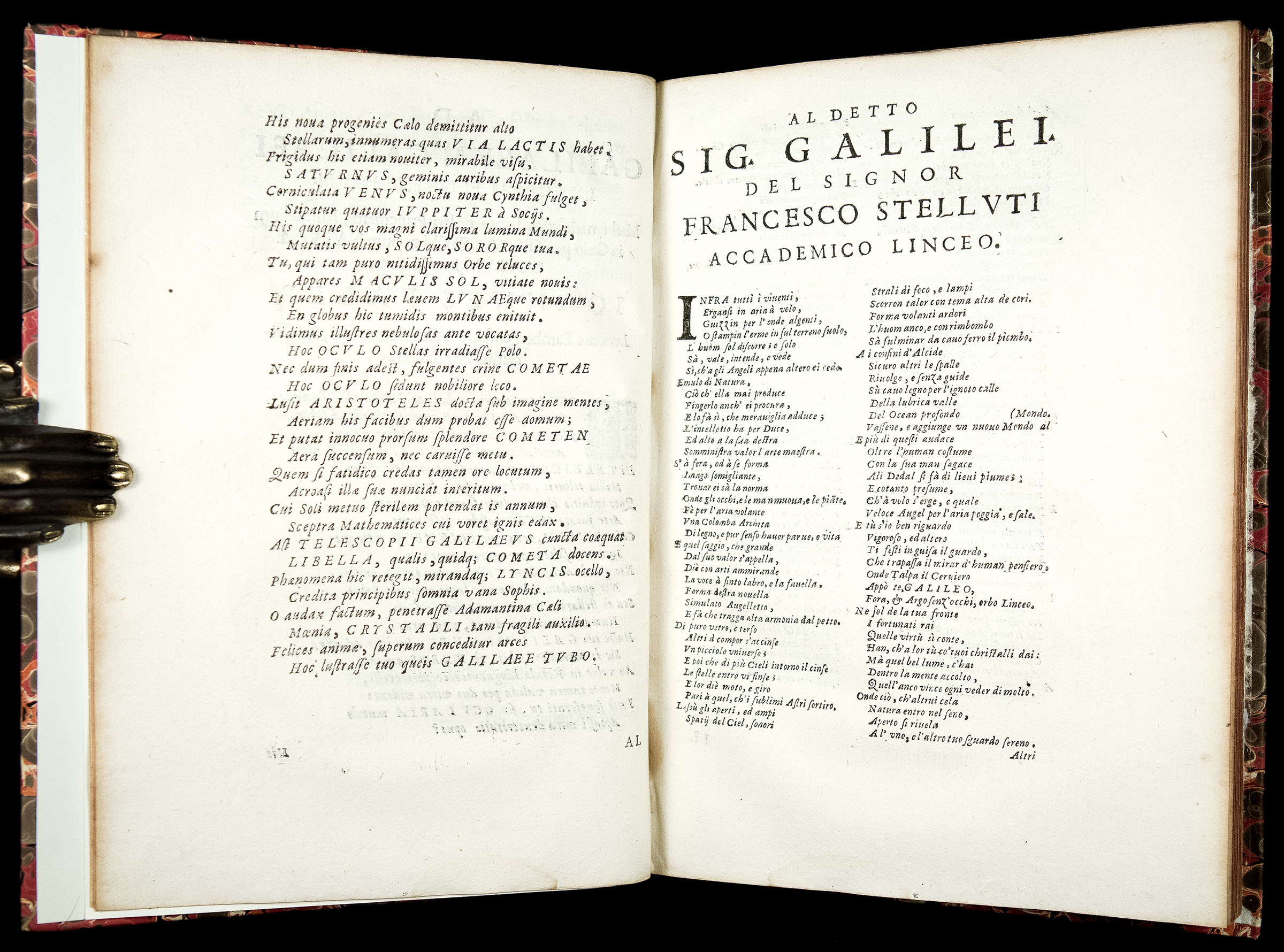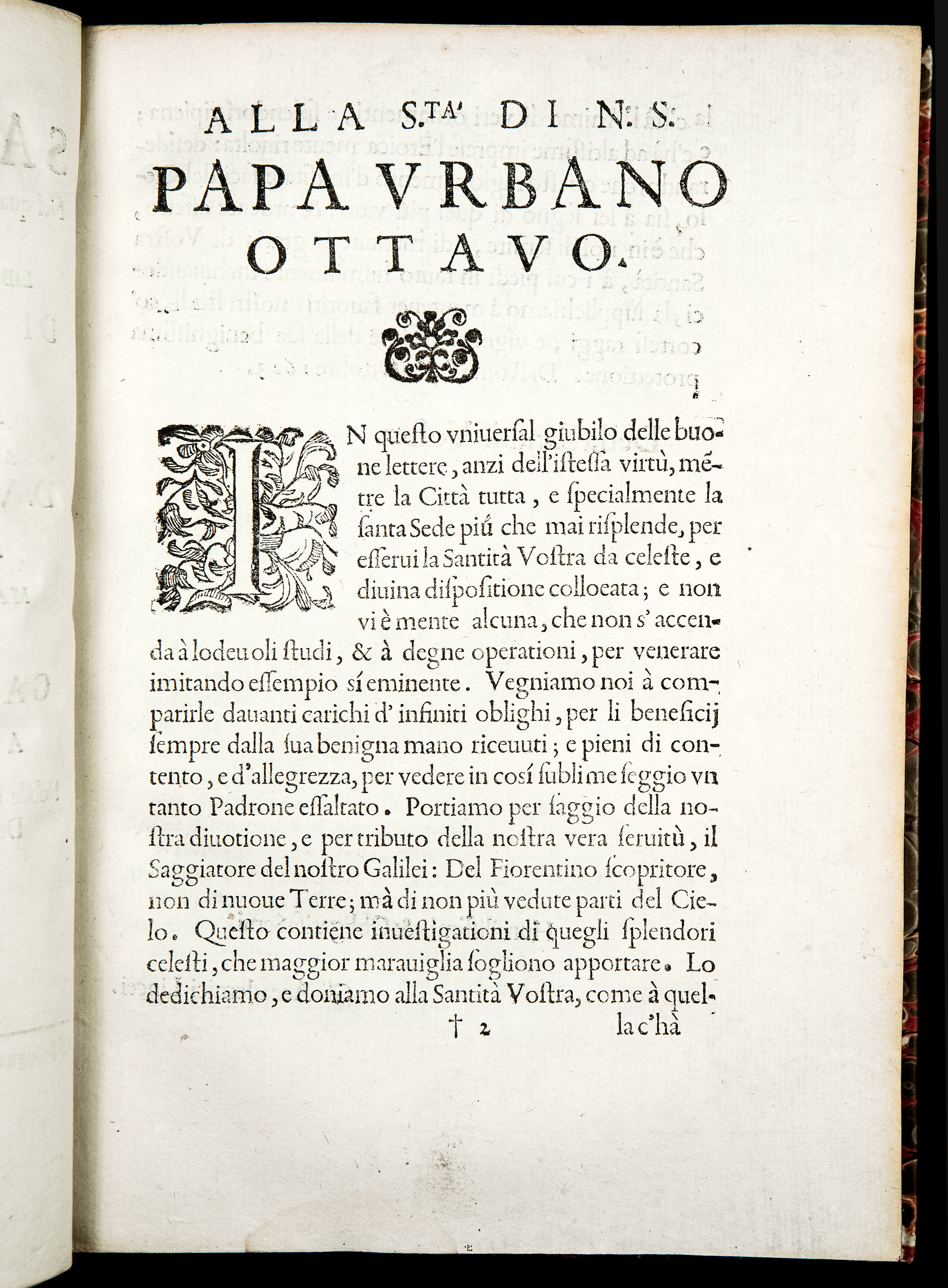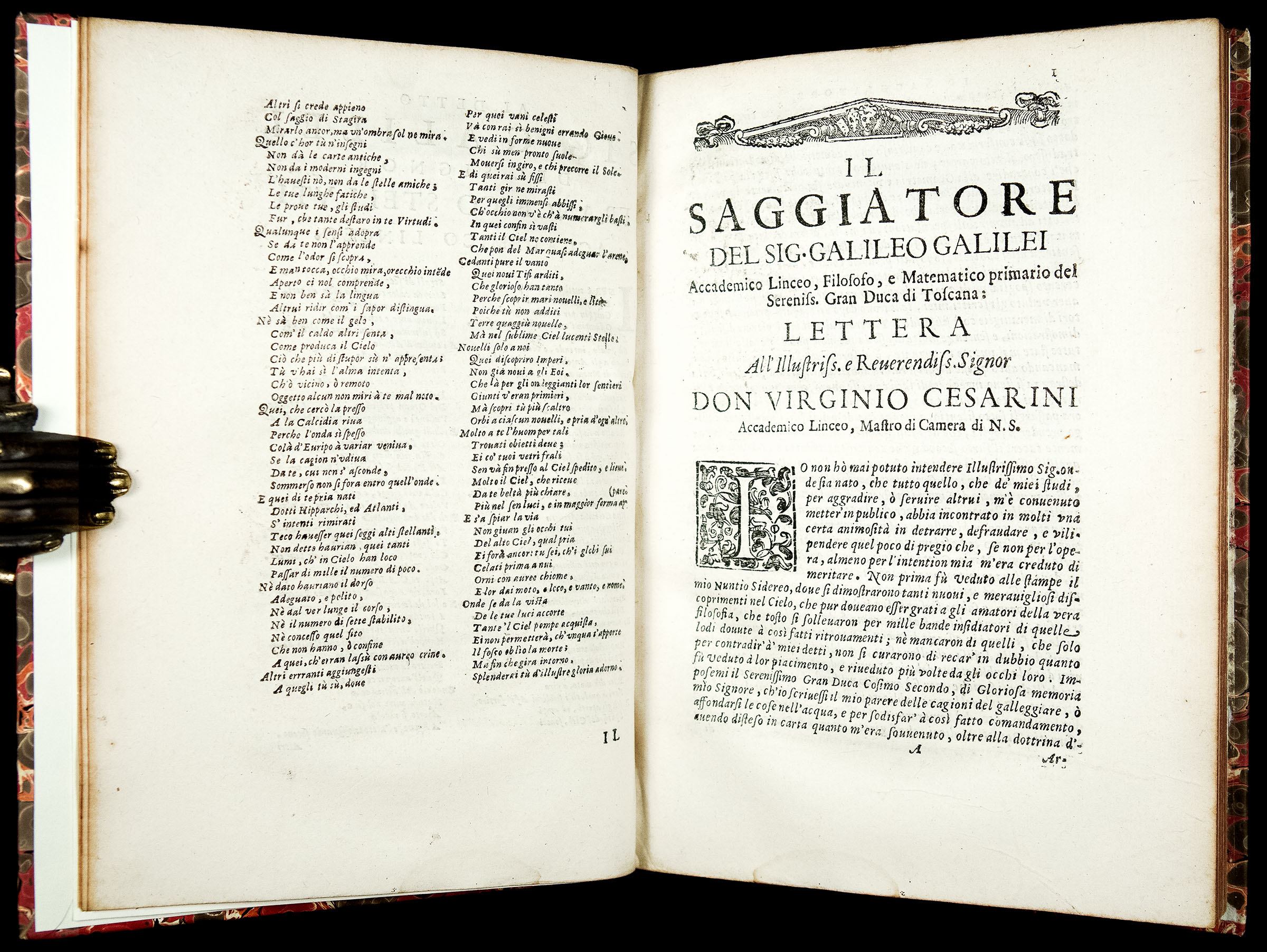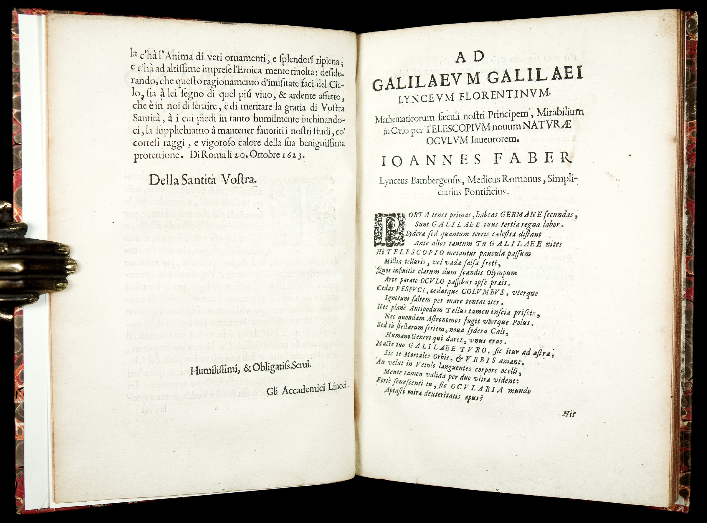 Preliminaries include Galileo’s dedication to Pope Urban VIII (Maffeo Barberini), and laudatory poems on Galileo by his friends Francesco Stelluti and Johann Faber.